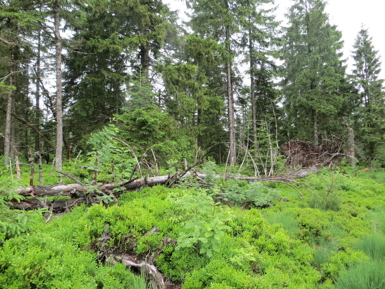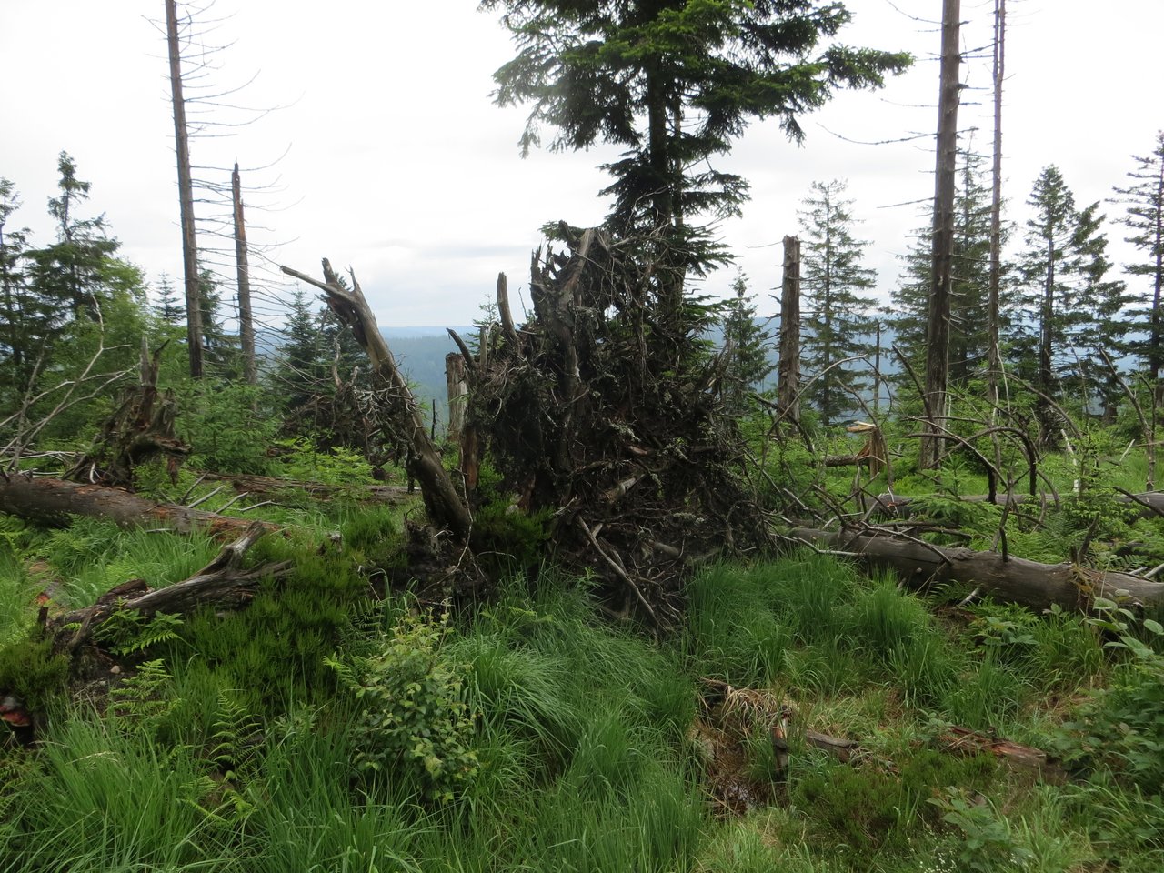 Nach einem Sturm oder einem Borkenkäferbefall kommen natürliche Entwicklungen im Wald in Gang, die die Teilnehmer aus der Nähe beobachten konnten. Einige Jahre nach dem Sturm beginnen die toten und umgestürzten Bäume langsam zu vermodern. Pilze sind hierbei maßgeblich bei der Holzzersetzung beteiligt. So werden die liegenden Stämme und Wurzelteller allmählich morsch, zerfallen und werden schließlich zu fruchtbarer Erde für neues Wachstum junger Pflanzen. Viele Tierarten leben in dem toten Holz und finden hier ein Zuhause und Nahrung. An anderer Stelle treiben umgefallene Bäume in skurrilen Wuchsformen wieder neu aus oder junge Bäume wachsen auf alten toten Stämmen auf.