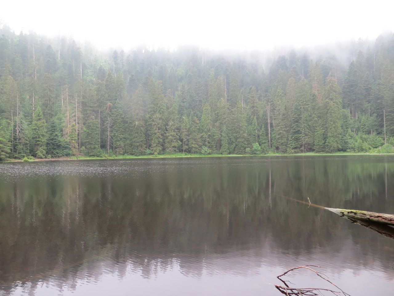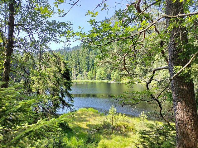Anschließend stiegen wir zum See hinab und ließen den Bannwald auf uns wirken. Was auf den ersten Blick nur nach totem Holz aussah, entpuppte sich auf den zweiten als üppiges, blühendes Leben. Junge Bäume, Flechten, Moose, Pilze und Farne sprießen überall und bieten Insekten, Vögeln und Fledermäusen einen idealen Lebensraum. Als wir unten am See ankamen, fanden wir eine typische Atmosphäre vor, die diesen Ort so charakteristisch macht. Ruhig und unbeweglich hingen Nebelfetzen zwischen den Bäumen und Nässe glitzerte auf Moosen und Blättern. Das Gesamtbild wurde noch durch den Gesang des Dreizehenspechts abgerundet. Der Ranger ging auf unsere zahlreichen Fragen ein und beschrieb die Artenvielfalt der Tier- und Pflanzenwelt im Nationalpark. Hierbei äußerte er auch die Vermutung, dass sich wieder Wölfe und Luchse im Schwarzwald aufhalten. Diese Vermutung wurde bekanntlich letzte Woche bestätigt, als ein toter Wolf bei Lahr entdeckt wurde.