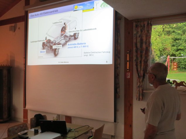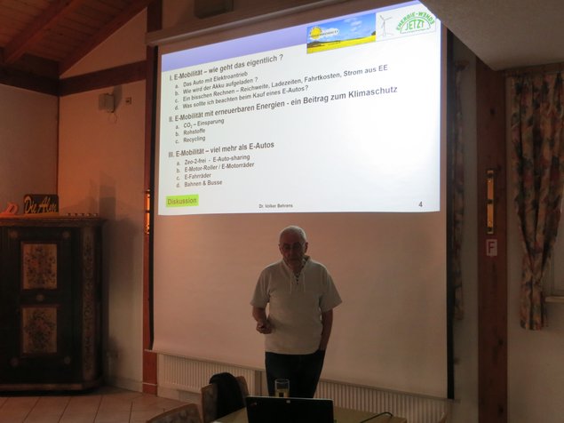 Die Grünen Walzbachtal konnten Physiker Dr. Behrens vom Initiativkreis Energie Kraichgau e.V. zu für einen Vortrag zum Thema „Grundlagen der Elektromobilität“ gewinnen. Dr. Behrens ging zunächst auf die Besonderheiten von Autos mit Elektroantrieb ein. Er thematisierte die Unterschiede zwischen einem Auto mit Elektro- und einem Auto mit Verbrennungsmotor. Bei den Elektromodellen gibt es ebenfalls viele technische Unterschiede, wie zum Beispiel die Art des Elektromotors, die Art der Leistungselektronik, die Art des Akkus und die Software. Anschließend ging Dr. Behrens auf die Rekuperation ein. Hierbei wird der Elektromotor beim Bremsen zum Generator. Er wandelt die Bewegungsenergie des Autos in elektrische Energie um. Diese wird in die Batterie eingespeichert und steht für die nächste Beschleunigung zur Verfügung. Hierdurch werden weniger Stromverbrauch und eine größere Reichweite erzielt. Beim Batterie laden ging Dr. Behrens auf die Besonderheiten beim Laden zu Hause und unterwegs ein. Bei den öffentlichen Ladensäulen fiel den Teilnehmern auf, dass beispielsweise in Jöhlingen noch keine Ladesäule vorhanden ist.