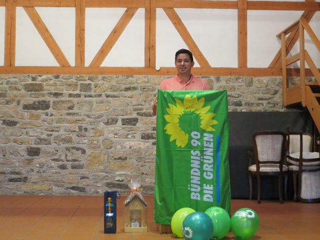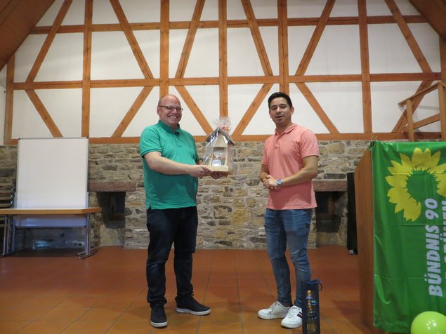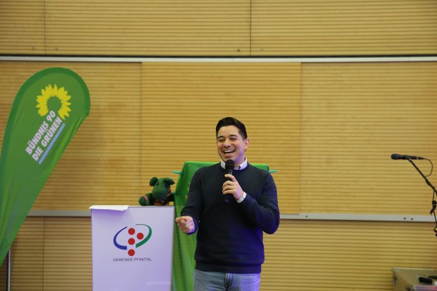 Als nächster Redner hob Bürgermeister Timur Özcan die gute Zusammenarbeit mit dem Ortsverband und der grünen Fraktion im Gemeinderat hervor. Als Beispiele nannte er die Themen Stadtradeln, pestizidfreie Kommune und Fair-Trade Town, alles Anträge, welche von der grünen Fraktion im Gemeinderat eingebracht und umgesetzt wurden. Abschließend verdeutlichte er die Gemeinsamkeiten „Nachhaltigkeit und Weltoffenheit“, welche von der Gemeinde und dem Ortsverband verfolgt werden, ehe er seine Rede mit der Übergabe von zwei Geschenken an den Ortsverband beendete.